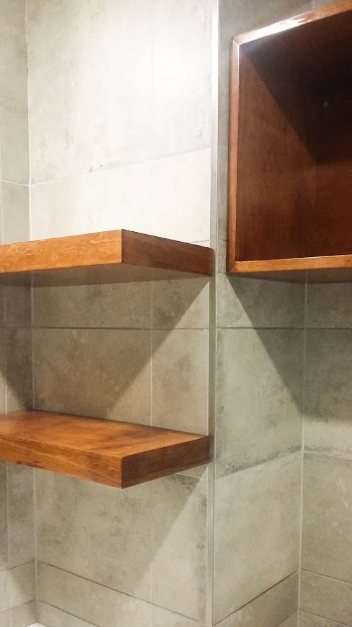 * Se colocaron estantes flotantes en columna lateral al espejo.* Se realizó módulo colgante para generar más lugar de guardado, también en madera de lenga.