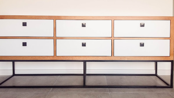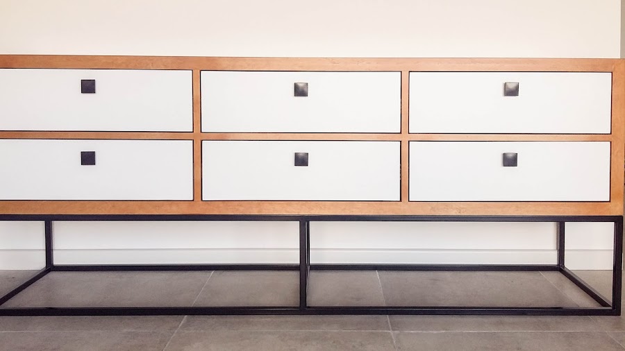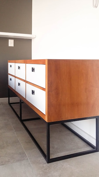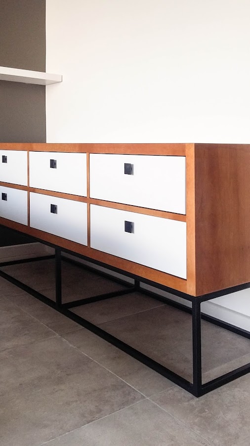 * Se realizó cómoda con envoltura en madera de lenga con lustre poliuretánico, frente de cajones laqueados en blanco y base en caño de hierro color negro, pintado al fuego.