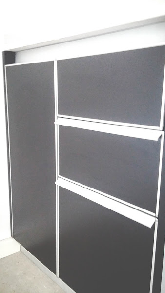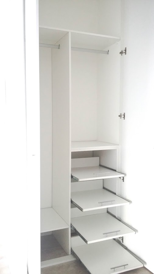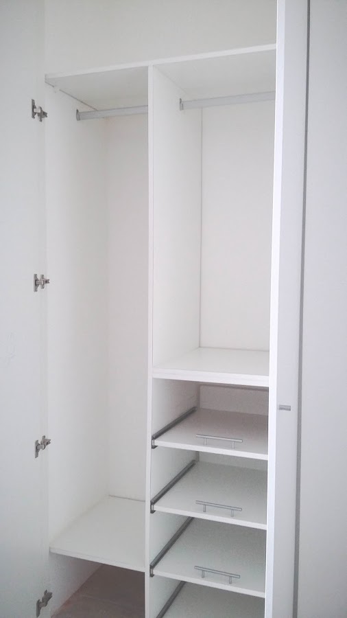 * Se realizó interior de placard en melamina blanca, con espacio para colgado de ropa corta y de ropa larga, baulera superior, pequeña baulera inferior y bandejas deslizables para zapatos y/o ropa.