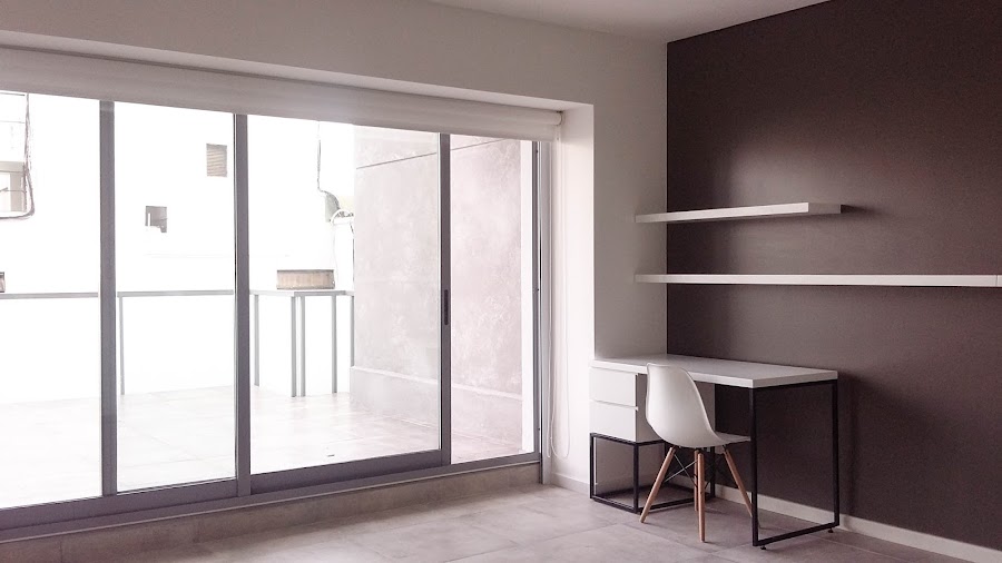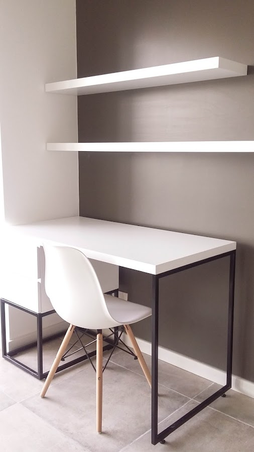 * Se realizó escritorio laqueado en color blanco, con 2 cajones con guías telescópicas y base en caño de hierro color negro, pintado al fuego. Acompañando toda la pared principal del dormitorio, se colocaron 2 estantes flotantes, laqueados en color blanco.