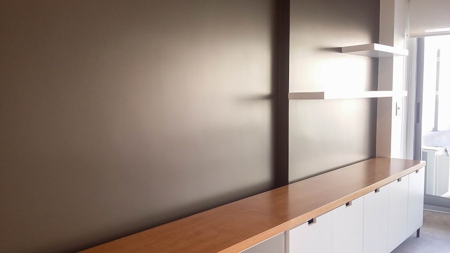 * Se pintó la pared principal en un color neutro oscuro para dar profundidad.