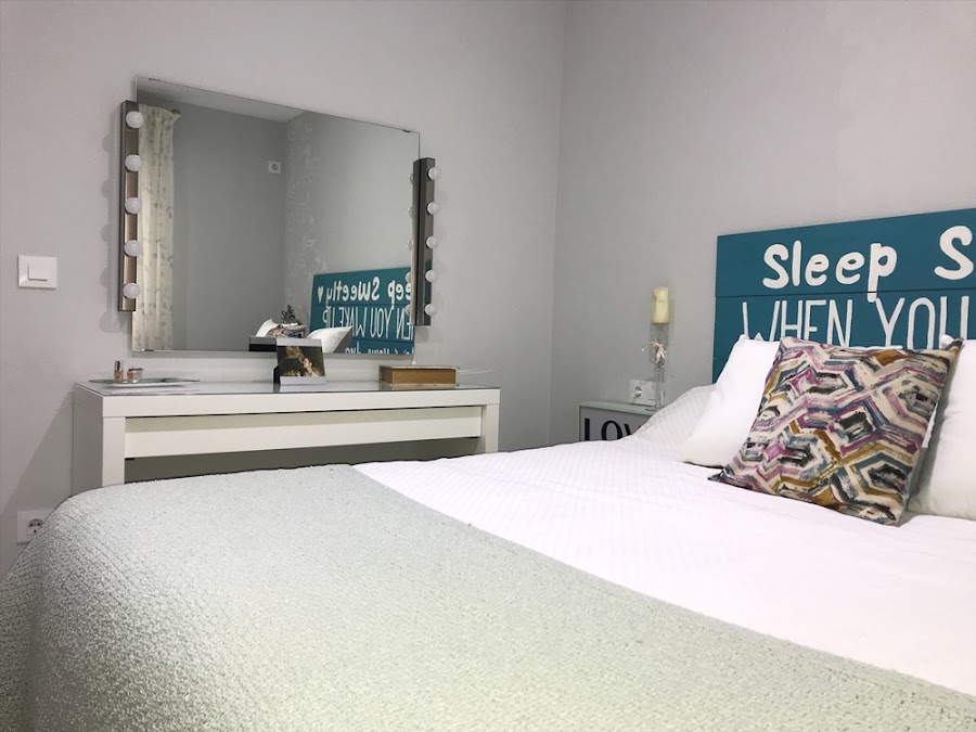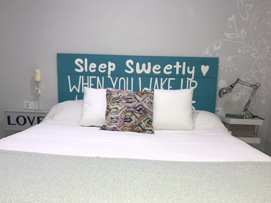 Si no encuentras el cabecero de tus sueños, ¡Crealo tu mismo!Como te he contado ella es muy manitas para el craft y quería un cabecero para su cama muy especial con una frase original, así que se puso manos a la obra y esta fué su creación.