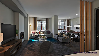 DESPUÉS: Se derriban los tabiques para conseguir mayor amplitud, se unifican visualmente el espacio de salón-comedor y la cocina que en la distribución original se encontraba al final del largo pasillo.