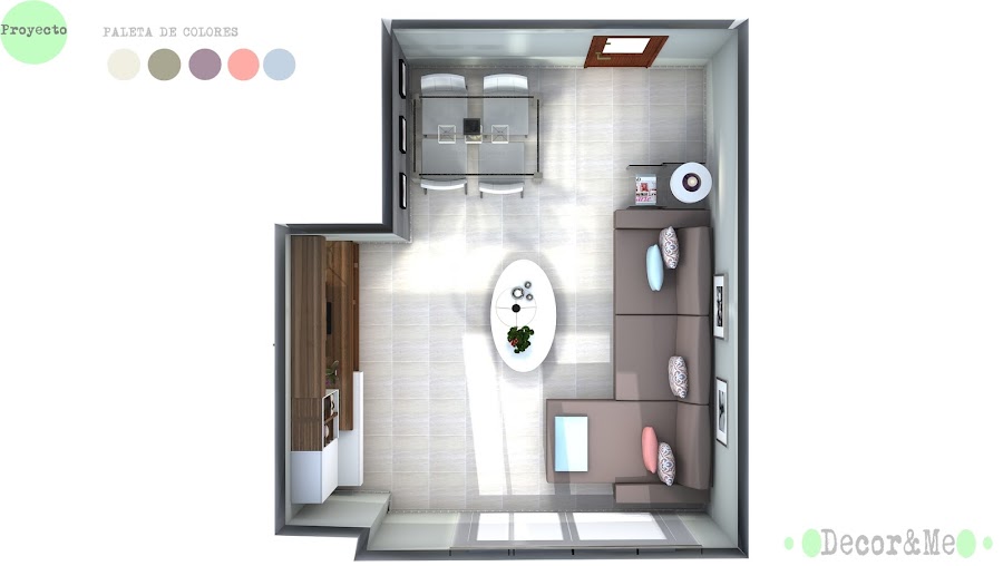 El ANTES/DESPUÉS de hoy me hace especial ilusión pues se trata de uno de los proyectos que ha realizado Decor&Me estos últimos meses. Hace unos meses se puso en contacto conmigo la clienta, estaba en plano cambio de su salón comedor, había comprado el mueble modular para el salón y el sofá pero estaba bloqueada y necesitaba ayuda con el resto de mobiliario, la pintura, paleta de colores y textiles. Como se encontraba en Sevilla, pensamos que la mejor opción sería un Asesoramiento A Domicilio, en el que además de realizar el proyecto, me encargaría de la búsqueda y compra de los muebles y la ayudaría con el montaje. Gracias a ella todo fue muy sencillo, me envío una fotografía del mueble del salón y el sofá y sobre ellos elegí el resto de mobiliario, como paleta de colores me basé en tonos grises (color elegido para la pintura), celeste, lila y coral, para los materiales mezclé la madera lacada en blanco con toques de nogal y el vidrio, acero y ecopiel en color blanco. Aquí tenéis el ANTES, algunos planos del PROYECTO y el DESPUÉS.