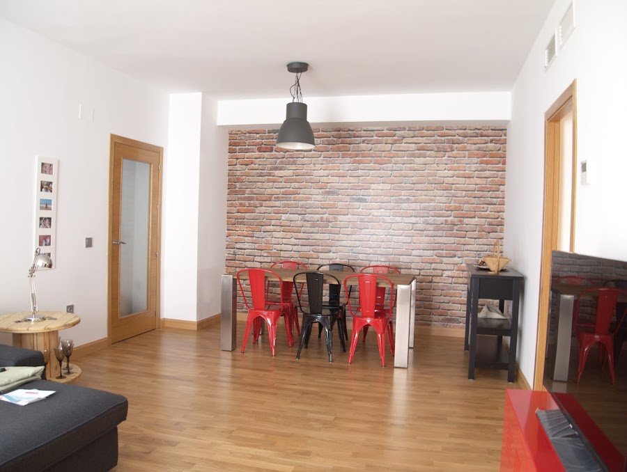 Para separar los ambientes y dar ese toque industrial empapelamos la pared con un mural simulando ladrillo antiguo, fue una opción económica y que quedó genial, la verdadera protagonista de este espacio es la preciosa mesa de madera de roble y patas de acero que completamos con 6 sillas tipo Tolix en negro y rojo (la paleta de colores elegida para el salón comedor se basaba en grises, rojos y negros). Para la sala de estar optamos por un gran sofá en color gris, un par de muebles metálicos en color rojo de Ikea y las bobinas de cable, que fueron lijadas y barnizadas y usadas como mesa de centro y auxiliar. Además retapizamos un sillón que tenía un gran valor sentimental para el propietario y que quedó estupendo. Fijaos en el palet pintado de gris que cuelga sobre el mueble tv, ha sido usado como "porta fotos".