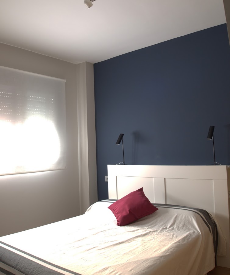El dormitorio se proyectó con un estilo más moderno pero siempre buscando ese toque masculino, posee dos armarios empotrados para la zona de la cama era bastante pequeña por lo que tuvimos que prescindir de las mesillas de noche, como solución el cabecero BRIMNES de ikea con almacenaje fue la opción ideal. La paleta de colores pasa por el gris azulado combinado con gris perla, para ser exactos la combinación azul-perla de la serie Patagonia de la colección Colores del Mundo de Bruguer.