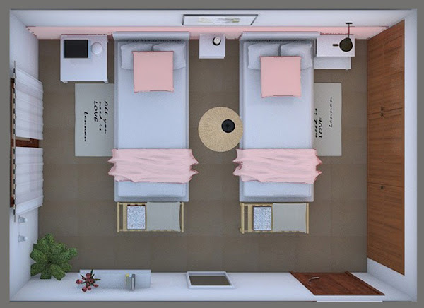 Para la última estancia, siendo una estancia con dos camas, quisimos darle un aire más juvenil y aportar un toque femenino. El zócalo de pintura rosa empolvado nos conquistó desde el principio.