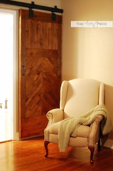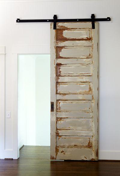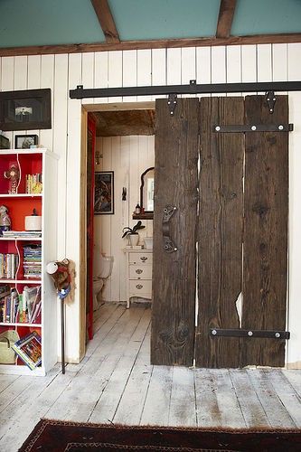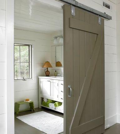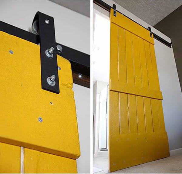 Es la típica puerta colgante con ruedas tipo caballeriza que ves en cuanta foto vintage e industrial hay, deja a la vista el riel por donde se desplaza.