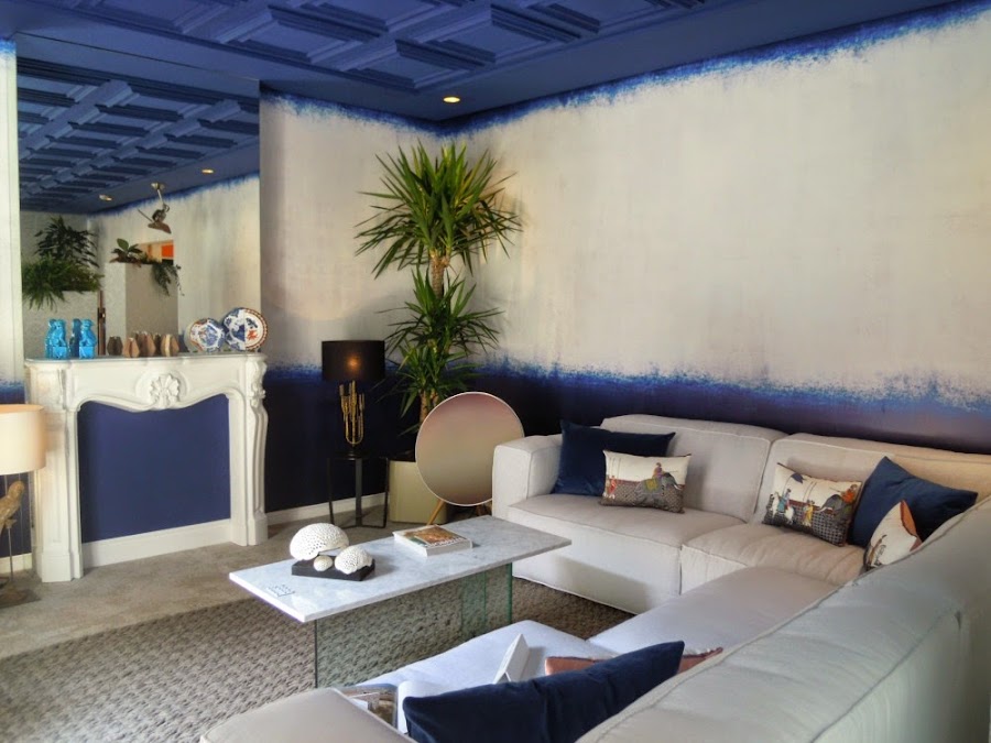 5 añadir el toques especiales, de sorpresa o humor, que en este caso son dos: el papel de efecto degradado que envuelve toda la pared y las molduras del techo teñidas de azul profundo que solemos ver en pintadas de blanco, y más frecuentemente en paredes.