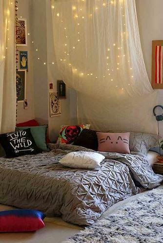 Mi habitacion ha sido engullida por una cama! Pero el puntazo de el techo en color alvero, la lámpara de lágrimas, un gran ventanal y la estantería, salvan a esta habitación y la convierten en una especie de "nido" acogedor y mullido.