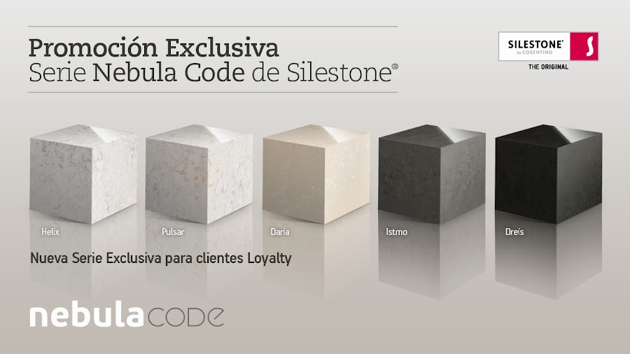 * Serie Nébula Code, un nuevo hallazgo tecnológico donde se dibuja patrones únicos, creando tablas especiales y diferentes entre sí, consiguiendo que no haya dos encimeras iguales.La serie Nébula Code, está caracterizada por la belleza de la irregularidad. Dentro, nos encontramos colores neutros para instalar en cocinas donde se quiera mantener un equilibrio entre el mobiliario y la encimera.