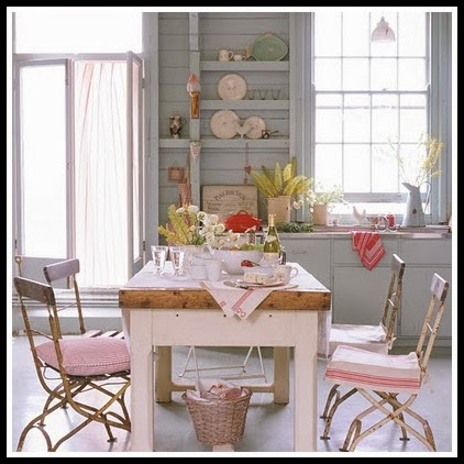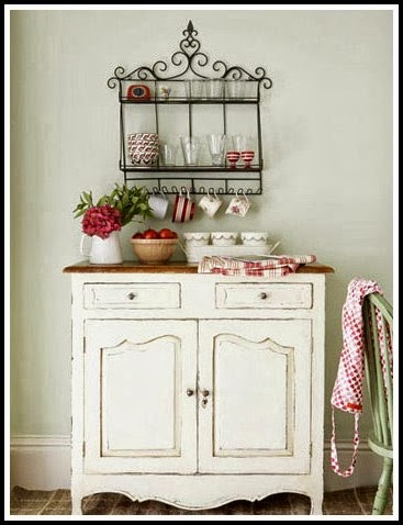 En los mueble de la cocina Country Chic se utiliza mucho en las alacenas las cortinas sustituyendo así las puertas