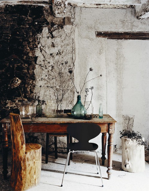 Son composiciones atrevidas de un gran impacto visual.Juegan con las texturas desgastadas ,algunas veces rústicas o barrocas,piezas de mobiliario que dejan ver con todo su crudeza el paso del tiempo, pareces desconchadas. Son decoraciones que muchas veces sólo podemos ver en fotos profesionales para el atrezzo de las sesiones fotgagráficas de las campañas publicitarias de las marcas o de las revistas del sector o y si me apuras en las casas de unos cuantos atrevidos...... pero no me negaráss que tienen una belleza visual impactante donde las haya.