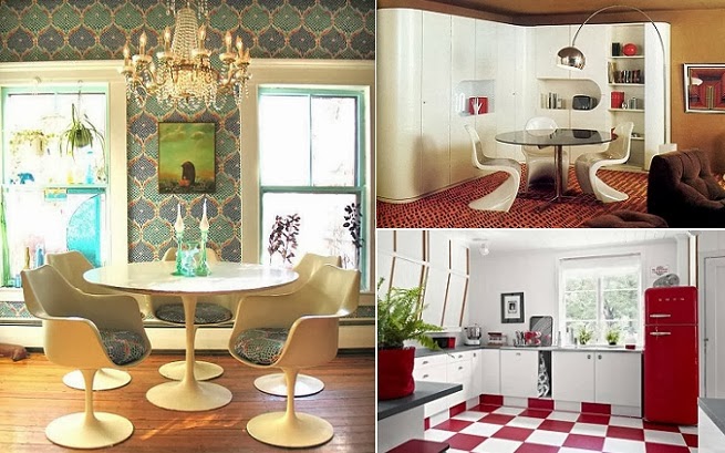 Las casas con estilo retro se caracteriza por colores chillones y contrastes, materiales como la pana o tejidos sintéticos y muchas formas geométricas como círculos o rectángulos. A esto se le suma la recurrencia a objetos de vidrio y de metal y utilización de imágenes provenientes de la cultura masiva.