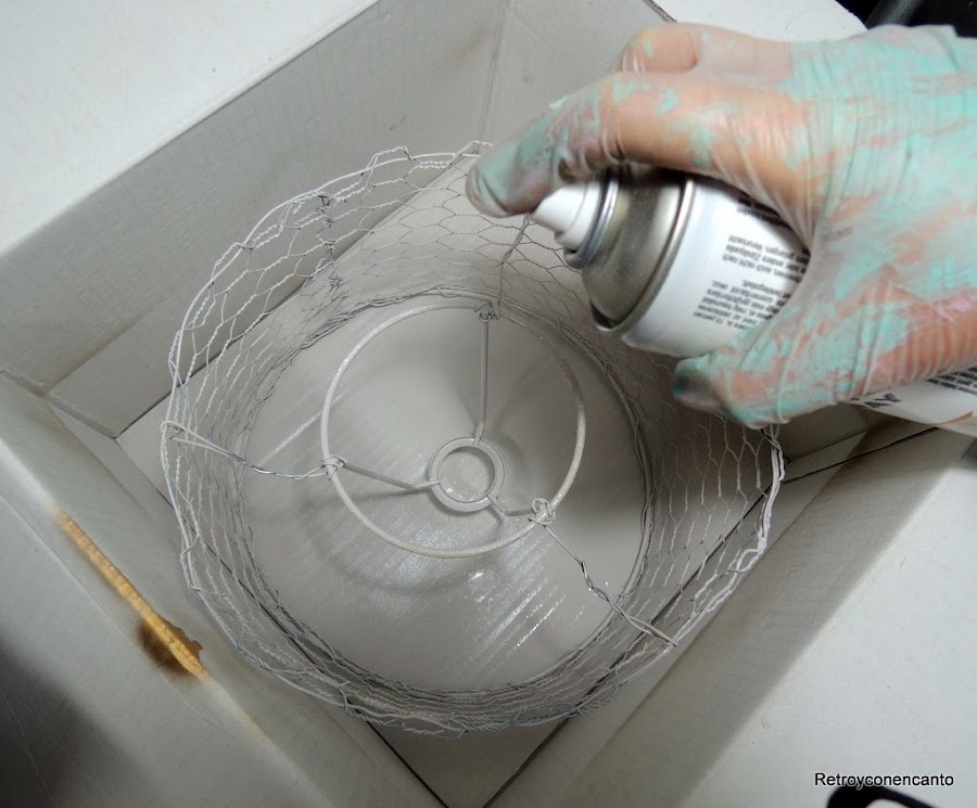 Pintura a la tiza en spray en color piedra. Para evitar salpicaduras, lo hicimos dentro de una caja de cartón.