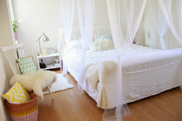 La habitación inicial pintada de un color naranja mandarina o mostaza claro (yo no soy muy buena con los nombres de las pinturas) estaba ya algo desmejorada, pedía a gritos un cambio y una actualización, el cabezal tapizado se podía aprovechar y por lo tanto con una poquita inversión y gran juego de textiles estaría todo el trabajo hecho.
