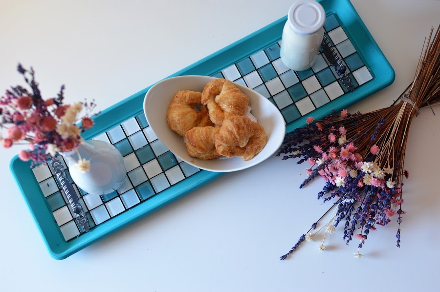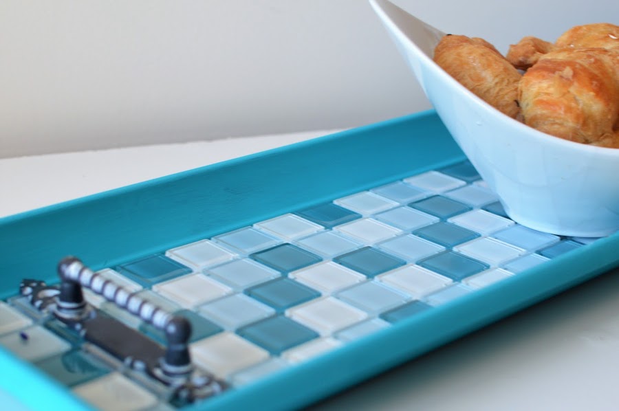 Esta bandeja diy no tiene ningún tipo de complicación. Yo tardé algo más de tiempo porque tenía que dejar secar la pintura, si has decidido no pintar, únicamente tienes que cortar la malla a la medida correspondiente con un cutter, despegar la pegatina que lleva en la parte trasera y colocarlo en el hueco. El pegamento lo usamos para fijar los agarradores en los extremos e ...¡voilá!