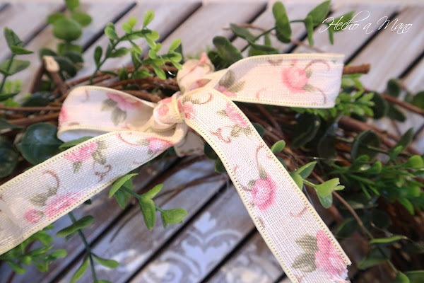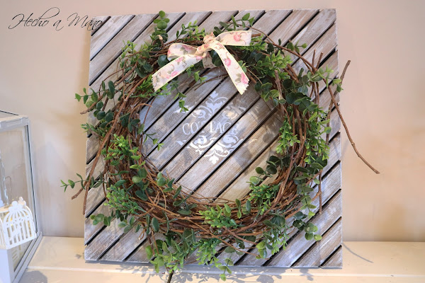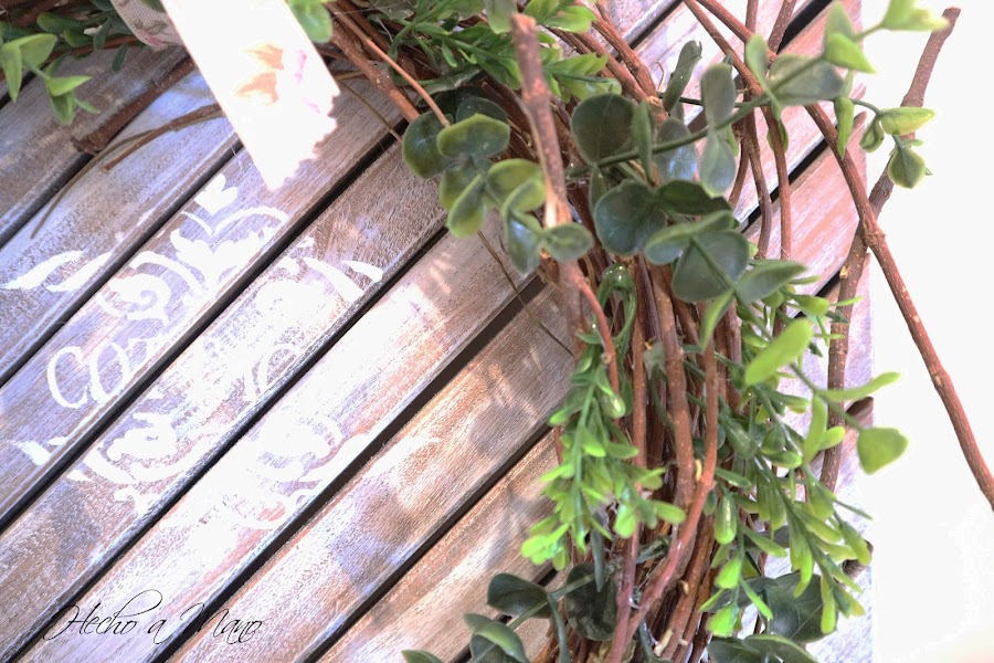 ¡¡¡Eeeeeso es!!!. ¡¡¡Bravo por ti!!!. Es una corona. Cada otoño al podar las enredaderas del jardín, hago acopio da largas ramas, que con cariño y paciencia, voy trenzando y dejando secar. Es ésta la razón de que la corona salga ya formada en la foto y también ha sido la pista de todas las pistas. Así que, unas ramas trenzadas, una de las maderas de la ducha de Daniel, que por el tiempo y el agua, ya se ve algo deteriorada y unos ramajos (artificiales) que andaban olvidados en un arcón, van a tener la culpa de lo que a continuación verás.