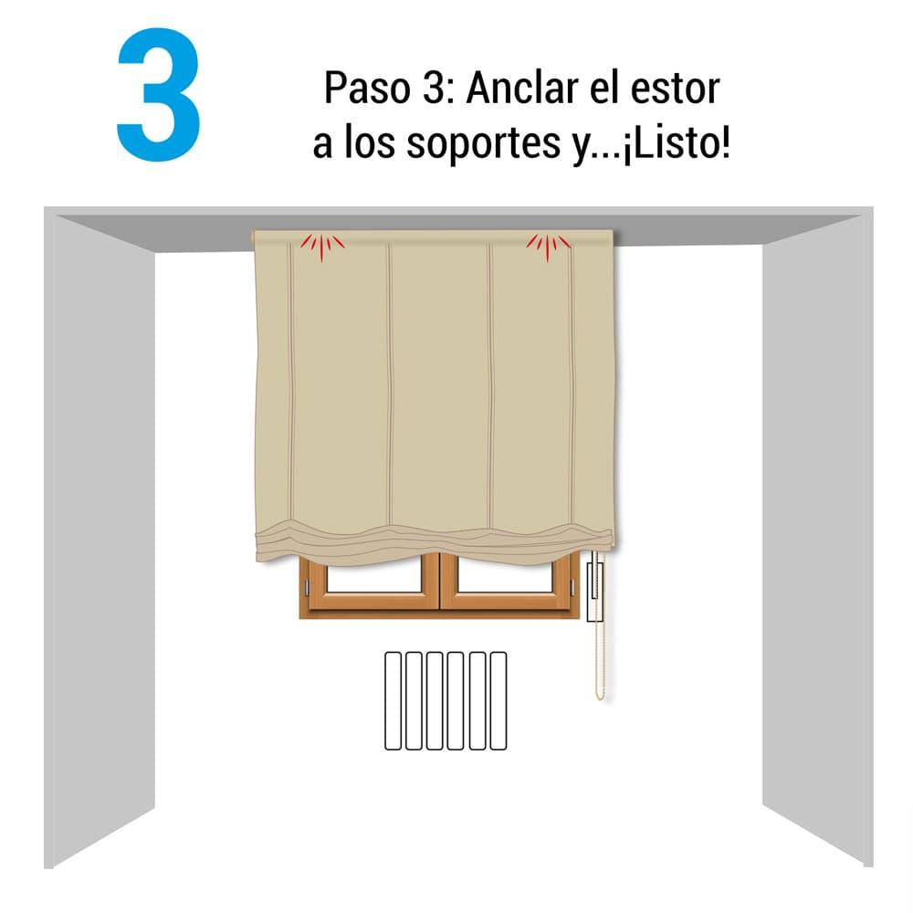 A la hora de colocarlos, bastará con ajustar cada enganche en la parte superior de la hoja de la ventana, de manera que quede fijo y bien firme, antes de proceder a colgar el estor.