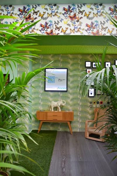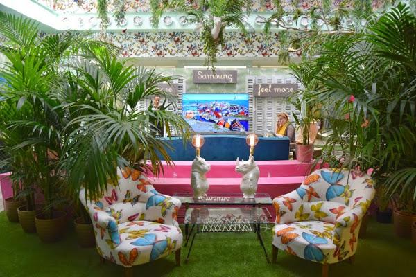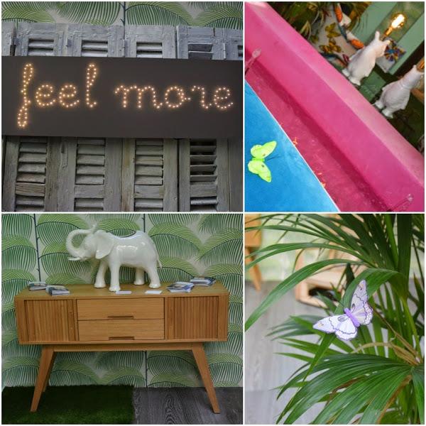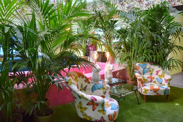 Paredes empapeladas con motivos vegetales, mariposas, bambú, mucha vegetación aportando el toque fresco del verde, un estanque fucsia, divertidas lámparas con formas animales, terciopelo, platos de cerámica...una mezcla divertida, armoniosa, actual y por qué no decirlo?, PRECIOSA, así, con mayúsculas.