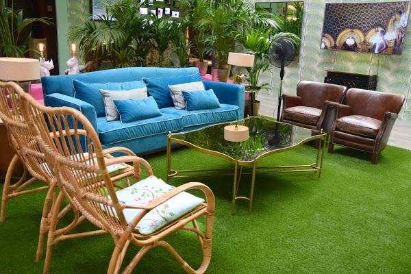 Realmente, no sé si a este espacio, se le puede llamar salón (porque se ha querido recrear un jardín de inviern), pero yo creo que sí, porque tiene los dos elementos que para mí no pueden faltar: tele y sofá. Y como os decía, no un sofá cualquiera, sino un espectacular sofá azul de terciopelo, acompañado por butacas de piel, bambú y una mesa de espejo que refleja la vegetación que cuelga del techo.