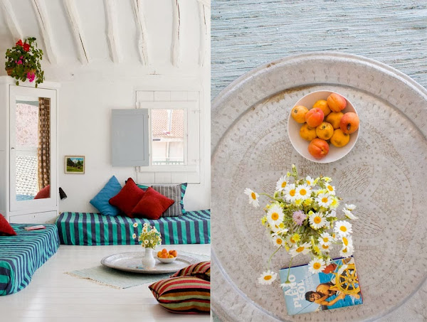 Mi buhardilla ideal se asemeja bastante a la que hoy os mostramos: blanca impoluta, con el marcado paso de los años en sus paredes y vigas, con mobiliario sencillo que ha sido recuperado tras tener mucha historia detrás, un par de colchones bien vestidos y en una zona cercana a la ventana para poder leer y presenciar el exterior... Si además incorporamos unos cojines kilims y una bonita bandeja marroquí, podemos crear un entorno lleno de encanto del que no querremos salir.