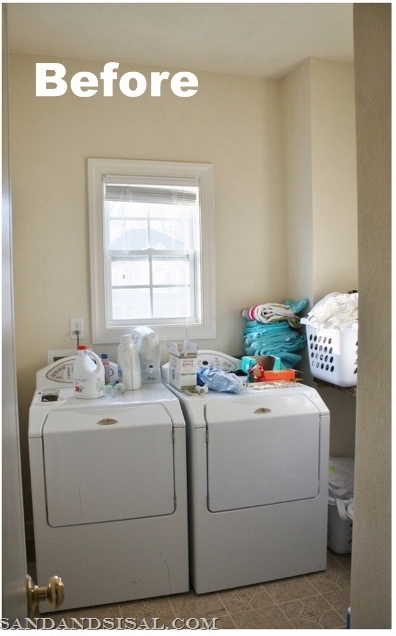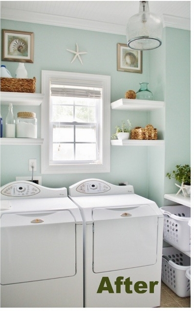 El cambio es espectacular, una alfombra de tejidos naturales para cubrir el suelo, la pintura en color mint que da mucha más luminosidad y alegría a la habitación, unas estanterías blancas, junto con una bonita lámpara de cristal y el falso techo de madera han conseguido dar un cambio redical a este cuarto de lavado, así da gusto hacer la colada!!