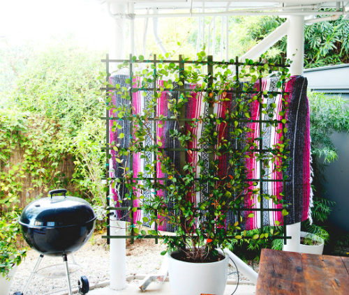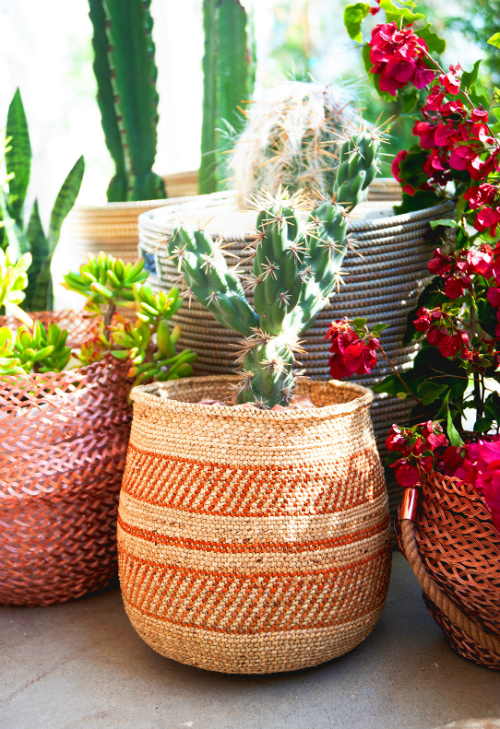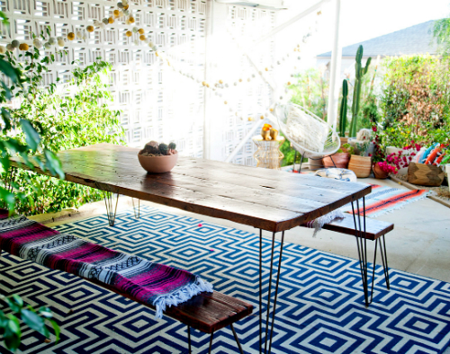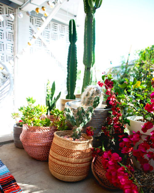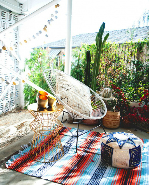 Como todos los meses el Grupo Quedamos en… nos volvemos a reunir y este mes como no podía ser de otra forma coincidiendo con el verano, hemos quedado en la terraza. Con el calor y el buen tiempo, qué mejor que pasar el tiempo sentado en una bonita terraza. En Mrs Boho hemos elegido la terraza que ha creado la editora y chef Claire Thomas a partir de su cochera en su casa de Los Ángeles. Como necesitaba un sitio donde pasar ratos al aire libre y juntarse con sus amigos para hacer fiestas y barbacoas, se le ocurrió que su gran cochera totalmente desaprovechada por dos pequeños coches, podría ser el lugar perfecto para crear la terraza de sus sueños. Claire ha querido crear un salón en el exterior, donde se pueda cocinar, sentarse a comer, reunirse con sus amigos y descansar para contemplar las vistas de Los Ángeles y sus preciosas plantas, que además de protegerle de las miradas indiscretas crean una zona verde muy refrescante. Quería darle el aire boho que a mediados de los 60 se respiraba en California, fecha en la que está construida la casa y yo creo que lo ha conseguido. La mezcla de materiales y texturas para ella es la clave en la decoración y en eso estoy muy de acuerdo. Una mesa y unos bancos de madera rústica con patas de hierro y cierto aire industrial, una silla Acapulco blanca, las plantas y cactus metidos en cestos de diferentes texturas y formas, una mezcla de textiles étnicos mexicanos y marroquíes al igual que el puff, junto con algún toque más sofisticado como la alfombra del comedor o la mesita auxiliar dorada, han conseguido ese look desenfadado y californiano de los 60 que ella quería. Y para ambientar las noches una guirnalda en blanco, dorado y gris que le da un toque bohemio y a la vez elegante haciendo juego con la mesa y la silla Acapulco.