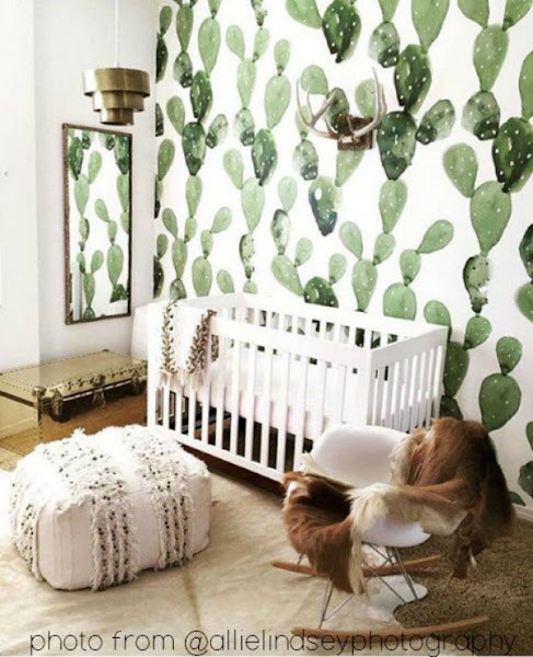 Y si por su edad, no nos parecen adecuedas de momento, podemos poner ese punto natural y vegetal por medio de un papel de cactus como éste de etsy tan espectacular.
