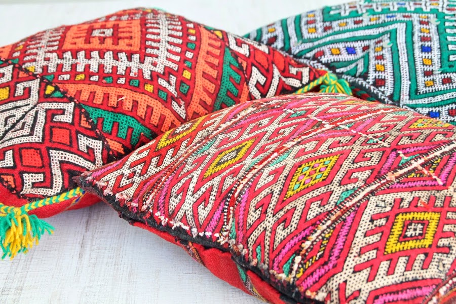Algunas veces dar amïna también se convierte en un pequeño e improvisado bazar textil, un espacio en el que nuestra casa se viste de bonitos cojines bereberes inundados de algodón, lanas de colores y muchas lentejuelas. Nos gustan especialmente por sus diseños geométricos y porque la mayoría de ellos son únicos e irrepetibles, las mujeres que los hacen, ubicadas en la región del atlas marroquí saben reconocer por sus dibujos, colores y materiales la familia que los ha realizado sin pensarlo dos veces. Aquí os dejamos una pequeña selección de ellos: