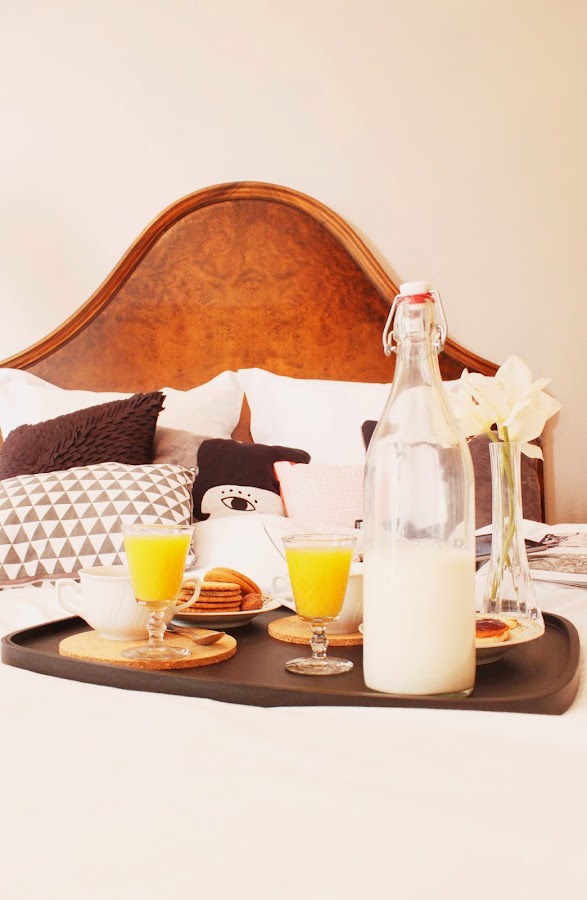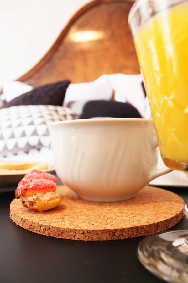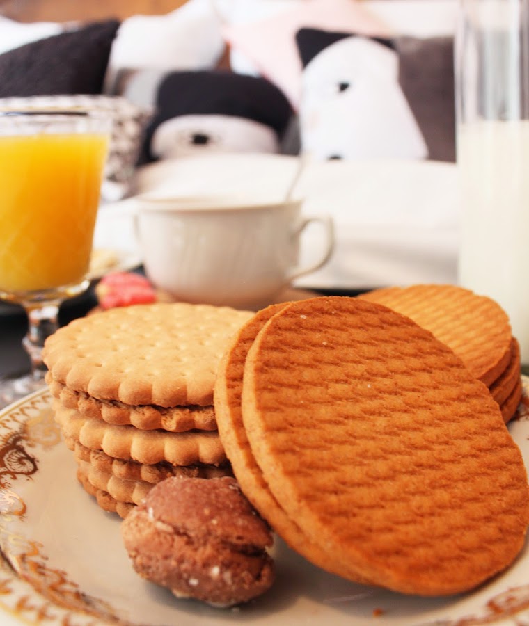 Un zumito de naranja, unos cereales y unas galletas acompañadas de unas pastas regalo de mi abuelo completan nuestro bandeja. Quizá sea mucho pero es la comida que más disfrutamos, el resto casi siempre las hacemos deprisa y corriendo.