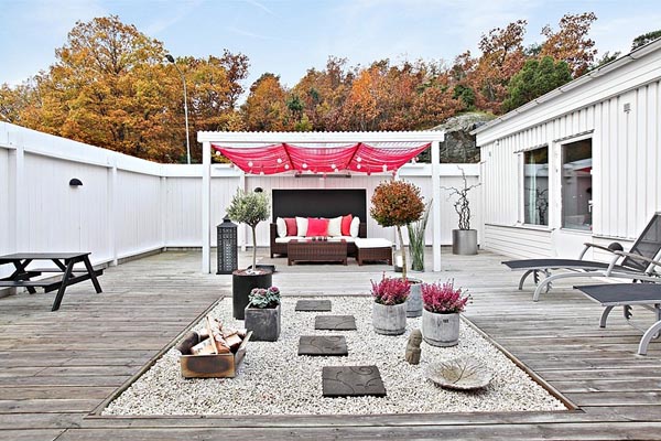 La terraza que he elegido me encanta por la paleta de colores escogida, blancos, marrones y grises contrastan con un rosa fucsia precioso.