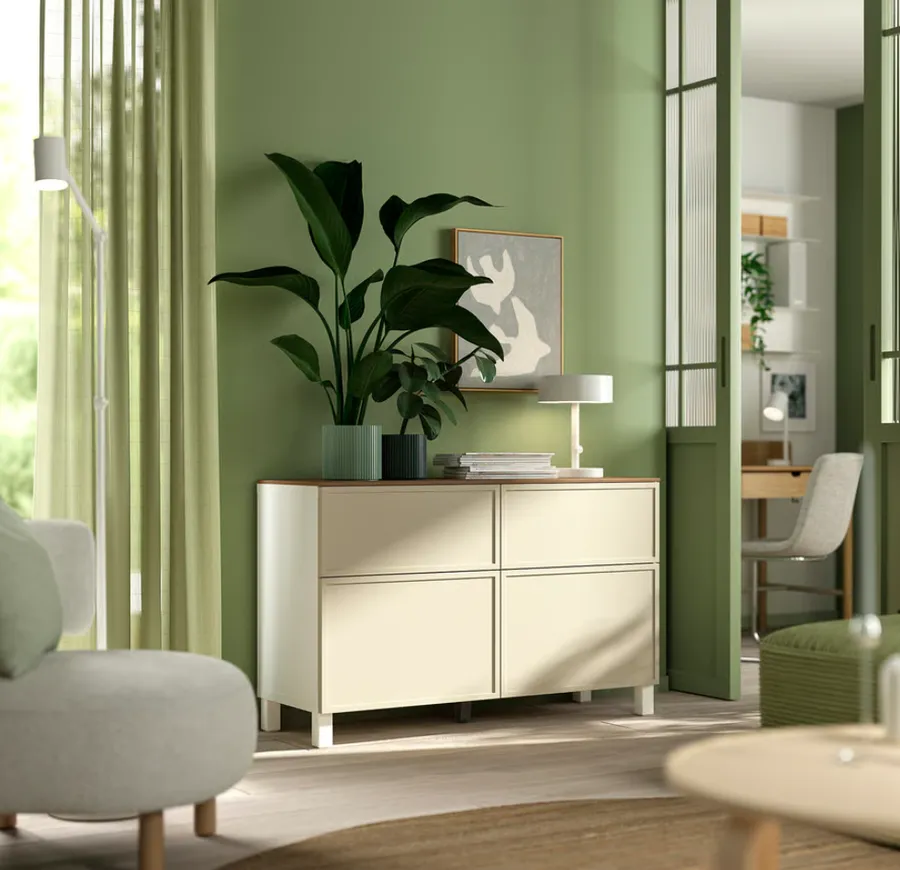 Para el salón uno de mis hallazgos ha sido el mueble BESTÅ. Un aparador elegante, con el sistema de puertas que se cierran supersuavemente, con cajones y la altura justa para que sirva de apoyo. Cuesta 260 € que, para el mueble que es, está tirado.