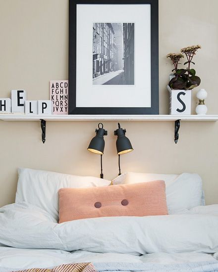 No puedo pasar por alto la idea de poner un estante decorado con nuestros objetos preferidos. Me parece una muy buena idea para solucionar un cabecero. Es práctica, cómoda y económica. Además cambiando los objetos, cabecero nuevo!