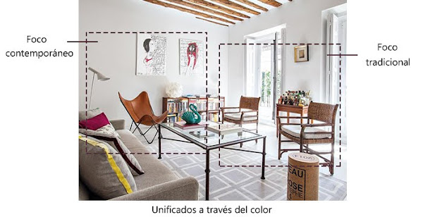 En este caso se hace una diferenciación clara agrupando los elementos por estilo. Consiguiendo así diferenciarlos. Separarlos solo sería un problema si los elementos del foco contemporáneo fueran de un color complementario u opuesto a los del foco principal.