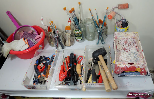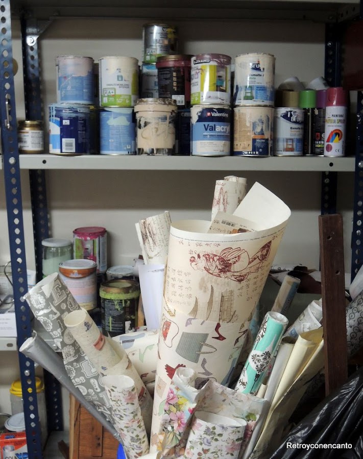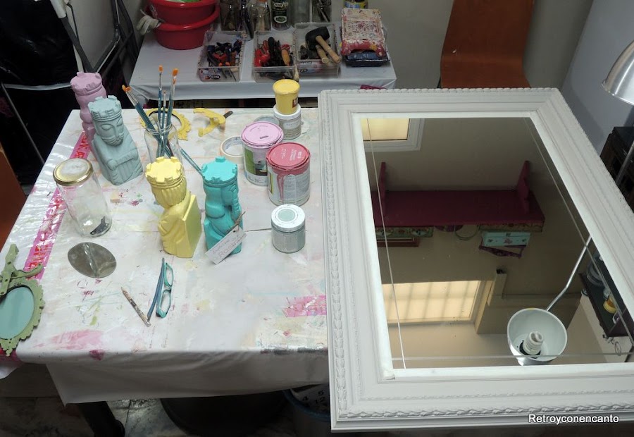 Aquí, en esta "maravilla de mesa", se fraguan nuestras ideas, con más o menos acierto. Continuamente cambiamos el hule que, como supondréis acaba pintado en cuanto lo ponemos, o roto por haber apretado más de la cuenta el cutter con el que sacamos las plantillas para decoupage.