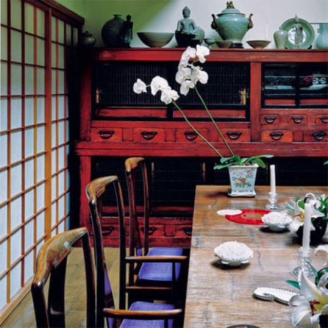 Una decoración con evidentes raíces japonesas, con su tradicional jardín interior, donde no puede faltar el agua y los elementos naturales, tan destacados en este tipo de decoración.