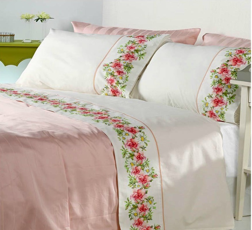 O date un gustazo con un juego de sábanas en satén de algodón 100%, que se caracterizan por un elegante brillo exterior y una buena consistencia del tejido y un fabuloso tacto, como este diseño con un estampado digital de flores difuminadas "tipo acuarela" en tonos rosados y grises, sobre un fondo claro.
