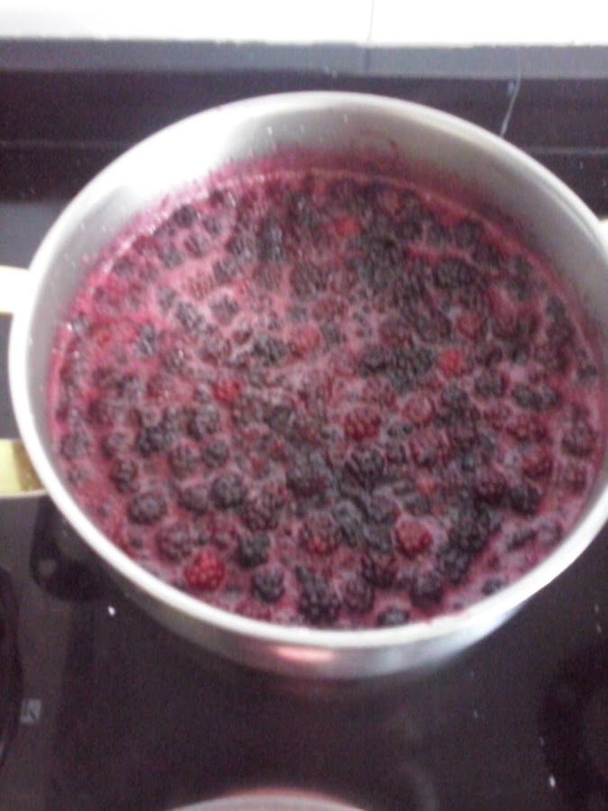 CADA KG DE MORAS 400 GR DE AZUCAR Y EL ZUMO DE UN LIMON (ACTUA DE CONSERVANTE NATURAL). Esta es la mezcla que debemos dejar reposar durante una hora y luego poner al fuego a punto de ebullición