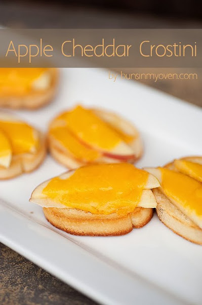 Horneamos las rebanadas de pan con un poco de aceite de oliva para que queden crujientes. A cada una le ponemos unas láminas finas de manzana y un poco de queso Chedar y horneamos durante 3min, hasta que el queso quede derretido. Servir caliente.