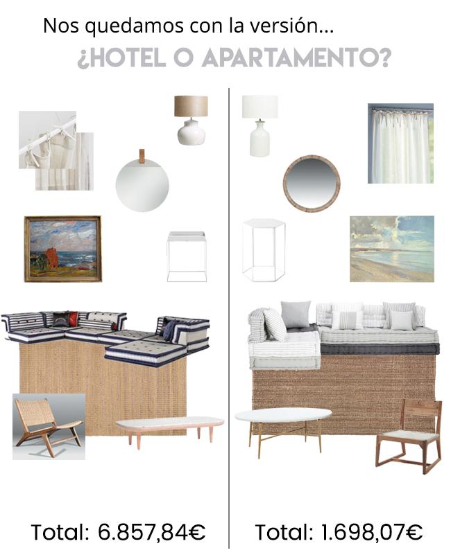 Así que para muestra, un botón. Hemos creado dos diseños similares en estilo y composición, aunque adaptados a presupuestos muy distintos. El primero está pensado para los amantes de las piezas de diseño, a quienes hemos visualizado de vacaciones en un hotel con todos los servicios incluidos. El segundo es para aquellas personas a las que también les gustan los espacios bien decorados, pero con un lado más práctico; son los que alquilan un apartamento para sus vacaciones.
