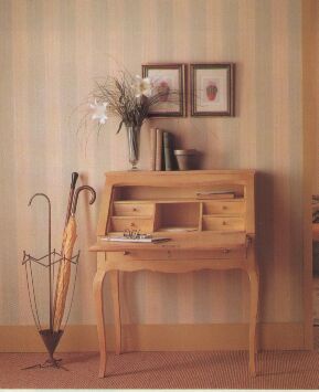 En el siguiente el juego de colores entre el papel de la pared y el mueble romántico y clásico.