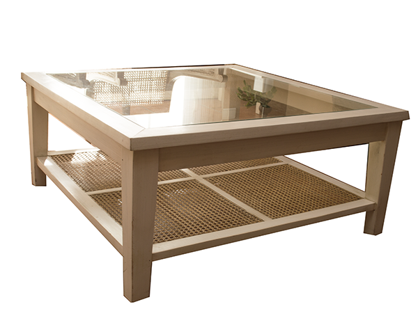 Mesa centro blanco decapé : ( R.016) Descripción: Mesa de madera maciza con rejilla y cristal