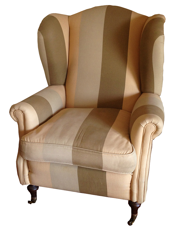 Sillón orejero : ( R.021) Descripción: asiento relleno tipo sandwich( no se deforma) patas de madera maciza. Patas delanteras con ruedas en color cobre.