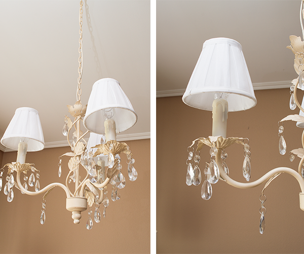 Lámpara techo : ( R.019) Descripción: lámpara techo color marfil, tres brazos con cristales y pantallas de pinza.
