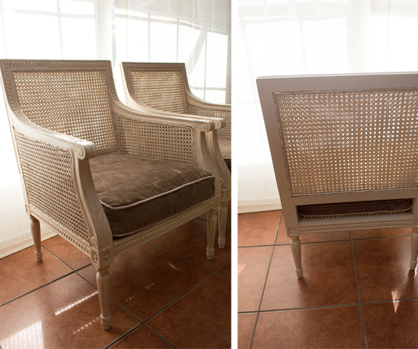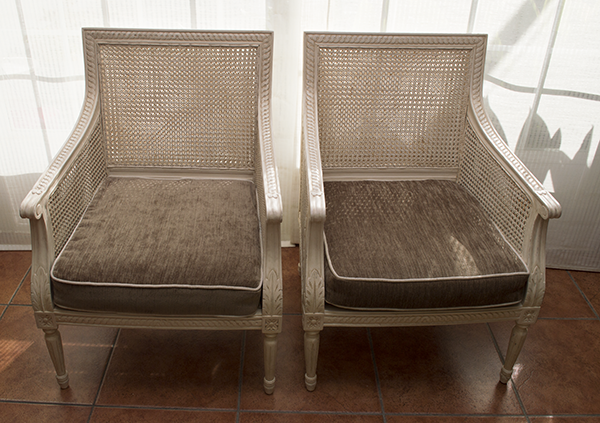 Sillón blanco decpé ( pareja) : ( R.017) Descripción: Sillones madera maciza en blanco decapé, asiento chenilla color topo.