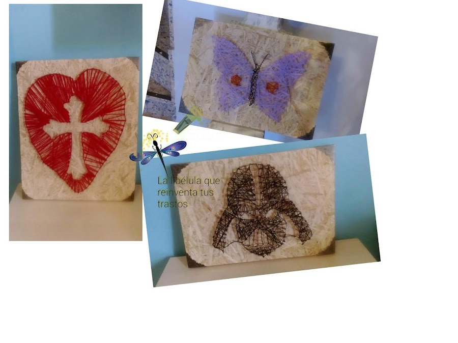 Como para el trabajo tenía que escoger una etiqueta de su blog, yo escogí, por su puesto, la de reciclaje, y decidí reciclar un tablón de virutas prensadas para convertirlos en cuadros con la técnica del hilorama.
