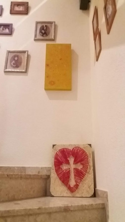 Aquí está en casa de la amiga (y bloguera) a la que se lo regalé, porque ella es toda fe y corazón. En este cuadro la cruz la hice en negativo, o vaciado, y el corazón es lo que rellené con la lana.