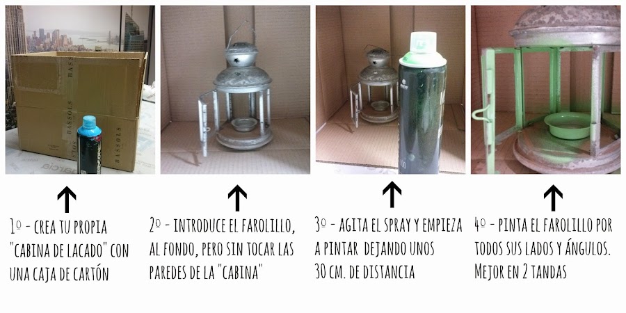 Ya sabéis que pintar con espray tiene muchas ventajas, pero la de no manchar no es una de ellas, así que para evitar salpicaduras indeseadas, lo mejor es crear tu propia "cabina de lacado", por ejemplo, con una caja de cartón :) Coloca el farolillo dentro, con cuidado de que no toque ninguna pared de la caja para aprovechar toda la pintura que flota dentro de nuestra improvisada "cabina". Agitamos el espray y... ¡a pintar! Debemos tener cuidado de ir girando el farolillo y no olvidar ningún lado. Lo mejor es hacerlo en dos tandas (o más si es que las necesitas) esperando a que seque entre una y otra para que al manipularlo no estropeemos el lacado.
