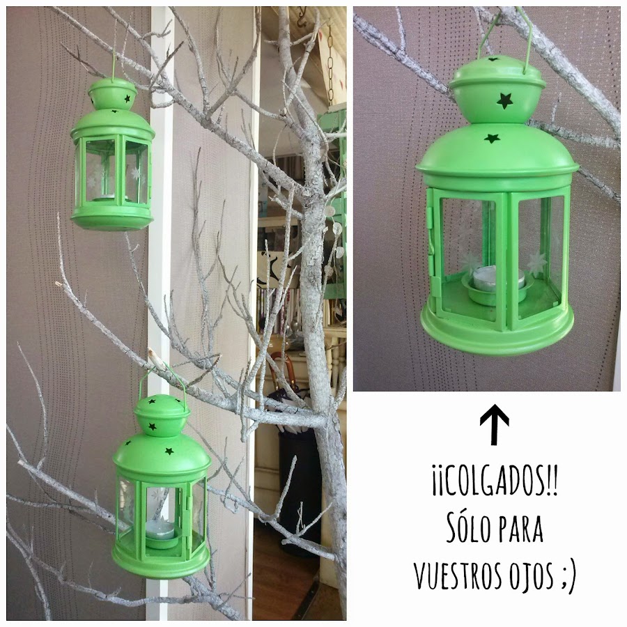 Y ¡ya está! Tenemos nuestros farolillos otra vez como nuevos, listos para la nueva temporada de terraza que empieza :) De hecho, me hubiera encantado mostrároslos en la propia terraza, pero mientras los hacía... ha vuelto a llover y no estaba la cosa para mucha terraza, así que, en su defecto, y sólo para vuestros ojos, los he colgado de las ramas del escaparate de la tienda para que los podáis ver en "todo su esplendor" ;)